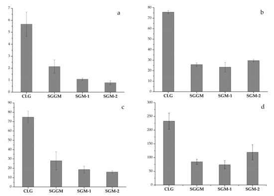 As we showed previously [35], the SGM and SGGM samples did not facilitate the hemolysis of human erythrocytes and, with an increase in their concentration in human blood/plasma, the time of the occurrence of a fibrin clot in the tests of the blood recalcification (BRC) time, activated partial thromboplastin time (APTT), and prothrombin time increased. The AT (aIIa) activity of the direct-acting anticoagulants attained 64.25 ± 7.30 U/mg.