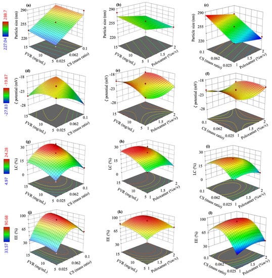In this study, we focused on studying the effects and interaction of crucial factors in developing CS-based NPs, particularly the CS, FVR, and poloxamer concentrations to produce a stable system with suitable characteristics for nano-based drug delivery. Previous studies discussed the influence of ALG:CS mass ratio in size and encapsulation efficiency (EE) owing to the low electrostatic affinity of the polymers leading to instability of the system. Furthermore, the effects of the drug concentration, especially hydrophobic molecules, along with the surfactant concentration play an important role in the formulation []. This is due to its effect on the size and % EE due to the production of unstable droplets and high tendency of coalescence because of unbalanced surface tension on the particles’ surfaces []. Preliminary experiments were conducted, and the concentration range being studied for the independent variables was selected based on previously published literature that gave a suitable physical characteristic for a nano-based drug delivery system and a stable formulation of hydrophobic drugs.