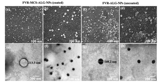 Smaller particles have a higher surface area that is advantageous for absorption and transport across the nasal cavity. The SEM (Figure 2a–d) and TEM (Figure 2e–h) images of FVR-MCS-ALG-NPs and uncoated FVR-ALG-NPs demonstrated well-dispersed spherical particles with minimal aggregation. As presented in Figure 2i–l, the uncoated-FVR-ALG-NPs exhibited a relatively small size and a higher (−)-charge than the FVR-MCS-ALG-NPs due to the absence of positively charged CS on the surface. A high LC (26.0 ± 0.7) and EE (84.6 ± 0.7) were achieved in the optimal formulation, which was beneficial for obtaining a high drug concentration in the polymer matrix while subsequently reducing the dosage concentration.