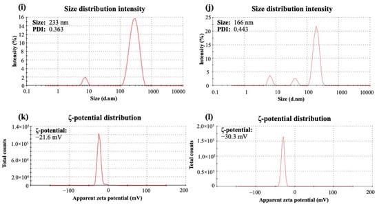 Characteristics of the optimized NPs: SEM images (at 50,000× (a,c) and 100,000× (b,d) magnification) and TEM images (100,000× (e,g) and 50,000× (f,h) magnifications); size distribution and ζ-potential of the optimal FVR-MCS-ALG NPs (i,k) and uncoated FVR-ALG NPs (j,l).