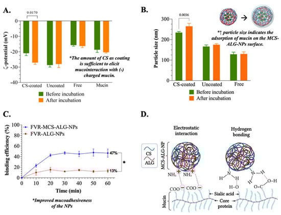 Mucoadhesive study: (A) ζ-potential and (B) size of the samples before and after incubation with mucin for 1 h; (C) mucin binding efficiency of the FVR-MCS-ALG-NPs and FVR-ALG-NPs as a function of time, n = 9 (* p = 0.0073); (D) illustration of the proposed mechanism of mucoadhesion of FVR-MCS-ALG-NPs.