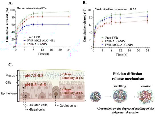 In vitro FVR released from NPs in the (A) mucus and (B) nasal epithelium environment (n = 3) through SnakeSkin™ artificial membrane; (C) illustration of the proposed release mechanism of FVR from the MCS-ALG-NPs.