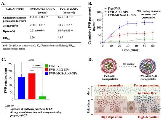 The transport and retention of FVR through PNM were investigated in nine (9) mucosal specimens from each treatment group. FVR-MCS-ALG-NPs (133.2 ± 11.0 µg/cm2) had superior permeation through the membrane with an area of 1.77 cm2 compared to the uncoated FVR-ALG-NPs (66.5 ± 11.8 µg/cm2) and free FVR (22.3 ± 13.8 µg/cm2) (Figure 5A,B). Due to the small size of the NPs and larger surface area, it can be noted that both NP formulations had a significant permeation after 1 h than the free FVR (p < 0.0001). The FVR-MCS-ALG-NPs had a significant permeation activity through PNM compared to the FVR-ALG-NPs (p < 0.0001). In addition, a significant amount of the FVR from the FVR-MCS-ALG-NPs and FVR-ALG-NPs was deposited in tissues compared to free FVR. Interestingly, the FVR retained (p = 0.0834) was similar to both coated and uncoated FVR-NPs. This can be explained by the slower permeation of the uncoated FVR-ALG-NPs that causes the deposition of FVR in the mucosa (Figure 5A,C). The superior permeation profile is evident in the computed Jss and Kp for the FVR-MCS-ALG-NPs which was significantly higher than the uncoated FVR-ALG-NPs and free FVR. The ERflux values showed 6-fold and 3-fold enhanced drug flux for FVR-MCS-ALG-NPs and uncoated FVR-ALG-NPs, respectively, versus free FVR.