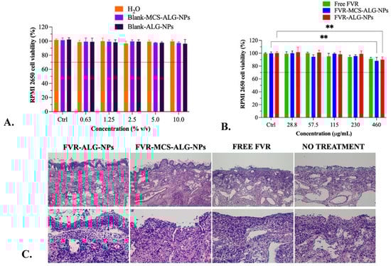 Sequentially, the cytotoxicity of the free FVR and FVR-NPs serially diluted in water and blank-NPs in various concentrations were investigated. There was a significant difference in the cell viability of RPMI 2650 when treated with the highest working concentration of 460 µg/mL (>88% viability) for FVR-NPs as compared to the control cells (Figure 6B). It is also evident that the reduction in cell viability is attributed to the drug itself as the control which was treated as the diluents used did not have any substantial cytotoxicity. Additionally, the cytotoxicity of FVR-NPs could be from the enhanced cellular uptake of the NPs in the RPMI 2650. Nonetheless, these values still comply with the ISO 10993-5 criteria (Biological evaluation of medical devices Part 5: Test for in vitro cytotoxicity), wherein it says that the reduction in cell viability by >30% is considered cytotoxic []. Hence, it can be deduced that the free FVR and FVR-MCS-ALG NPs have excellent compatibility with RPMI 2650. Moreover, the histopathological changes in the excised nasal mucosa were examined by a licensed veterinary pathologist who was blinded to the treatment. The nasal mucosal histology showed no significant lesions, which are common indications of toxicity in nasal epithelium by NPs (Figure 6C).