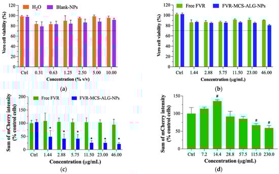 As SARS-CoV-2 is classified as a risk group 3 pathogen that requires extremely stringent safety precautions and specialized laboratory facilities, we employed non-infectious coronavirus as a surrogate for the antiviral studies. The porcine epidemic diarrhea virus (PEDV, NCBI accession LC053455) was selected as a model due to its low health risk and minimal laboratory requirements. It has biophysical properties and genomic structures similar to human coronaviruses, such as SARS-CoV-2 []. Previous reports on the proof-of-concept of the use of the PEDV corona model have proven it to be a reliable surrogate for SARS-CoV-2 []. Vero cells stably expressing eGFP (eGFP-Vero) were used as host cells for PEDV carrying the mCherry fluorescent reporter gene (mCherry-PEDV) (Supplementary materials S1.2). The cytotoxic effect of sterile water (H2O) and blank-MCS-ALG-NPs was first tested to determine the possible toxicity of the diluent in eGFP-Vero cells as described in Supplementary materials S1.3. Neither test sample exhibited any relative cytotoxicity to eGFP-Vero cells even at the maximum concentration (Figure 7a and Figure S2). Furthermore, the non-cytotoxic concentrations of FVR showed no substantial toxicity to host cells (>80% viability) across all concentrations investigated (Figure 7b).