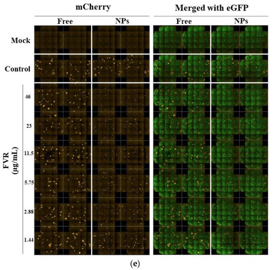 The anti-viral effect of FVR samples was performed in three independent experiments (Figure S5 in Supplementary). The stitched images of mCherry and eGFP signals from the cells were acquired by a high-content imaging system at 21 images/well (Figure 7e, Figures S3 and S4 in Supplementary). The antiviral assay of FVR-MCS-ALG-NPs caused a drastic reduction in viral replication with an EC50 of 6.63 ± 2.42 μg/mL calculated by GraphPad® Prism software 8.3.0 (Figure 7c). The post hoc test confirmed that the FVR-MCS-ALG-NPs had a significant inhibitory effect on viral replication even at its very lowest working concentration compared to free FVR and the control cells (p < 0.0001), while free FVR did not have any significant reduction in PEDV replication up to 46.0 μg/mL (p > 0.9). To further determine the antiviral activity of free FVR, we investigated the samples in higher concentrations that were non-toxic to the eGFP-Vero cells (Figure 7d and Figure S6 in Supplementary). We found that the free FVR had a significant reduction in viral replication starting at a concentration of 115 μg/mL. These results strongly suggest that the FVR-MCS-ALG-NPs exhibited a significant improvement in antiviral activity towards coronavirus by more than 35-fold compared to the free drug (EC50 6.63 ± 2.42 vs. >230 μg/mL).
