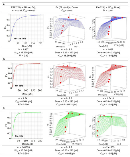 Median inhibitory concentrations of erufosine on the cell lines HuT-78, HH and MJ. Legend: ERF—erufosine; m—hillslope; R2—coefficient of determination; IC50—inhibitory concentration 50% (median inhibitory concentration); Fa—drug effect; (A)—Cell line HuT78 (Sézary Syndrome); (B)—Cell line HH (cutaneous T-cell lymphoma); (C)—Cell line MJ (Mycosis fungoides).