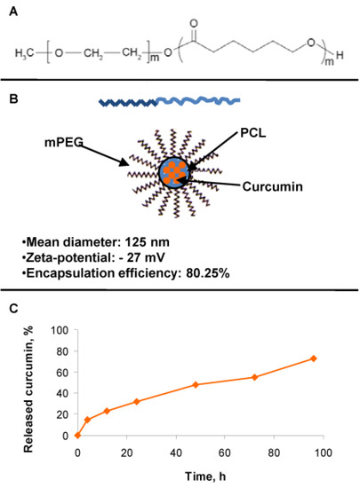 Structure of the micelles and achievement of sustained release with slightly pronounced burst release of curcumin. Legend: (A)—Copolymer carrier mPEG-PCL; (B)—curcumin loaded mPEG-PCL micelles and their physicochemical properties; (C)—curcumin release from the loaded mPEG-PCL micelles.