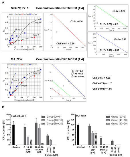 Based on the calculated median inhibitory concentrations of ERF, we planned the combination treatment following the recommendations and the schema for constant combination ratio in the manual of Chou and Talalay [Manual of CompuSyn. Inc., Paramus, NJ, USA]. The following two combination ratios were investigated: 1:2 and 1:4 [ERF:MCRM]. The highest concentration of ERF used was near the IC50 value, and only the concentrations of MCRM were increased up to 80 µM as far as curcumin is less toxic than ERF to normal cells. Only the combination ratio of 1:4 led to synergistic (HuT-78) or additive (MJ) interactions. The results are presented in Figure 3A. The CI values of the combination 80 µM MCRM and 20 µM ERF for HuT-78 cells were lower than 0.9 for all three Fa observed (50, 75, and 90% inhibition of the cell viability), which is indicative of synergism (CIFa(0.5) = 0.35, CIFa(0.75) = 0.2, CIFa(0.9) = 0.17). For MJ cells, an additive effect was achieved by Fa0.9. The data from the CFU test (Figure 3B) revealed 100% CFU inhibition in HuT-78 cells for the combination [20 µM ERF/80 µM MCRM]. In MJ cells, treatment with 40 and 80 µM MCRM and the respective combinations with ERF led to complete CFU inhibition.