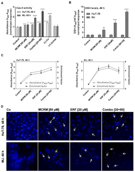 HuT-78 and MJ cells were seeded in 6-well plates at a density of 0.3 × 106 cells/mL, incubated for 24 h, and treated thereafter with 20 µM ERF, 80 µM MCRM, or the combination of both for further 48 h. Cells were counted and 1 × 106 cells/sample were washed three times with PBS and frozen at −80 °C. The measurement of caspase-3 activation was performed with the Caspase-3 DEVD-R110 Fluorometric and Colorimetric Assay Kit (#30008, Biotium, Fremont, CA, USA) following the experimental protocol of the manufacturer. The absorbance was measured at λ = 490 nm on an Absorbance Microplate Reader EL-800 (Bio-Tek Instruments Inc., USA). As positive control, HL-60 cells (5 × 104) were used and incubated in hypertonic buffer (10 mM Tris, pH 7.4, 400 mM NaCl, 5 mM CaCl2 and 10 mM MgCl2) for 2 h at 37 °C.