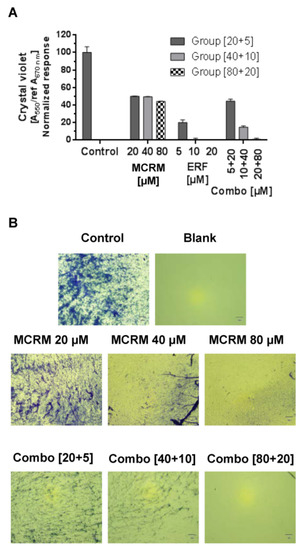 The biofilm formation assay was performed according to the protocol of Stepanovic et al. [68]. Two-fold serial dilutions of the combinations between ERF and MCRM in concentrations ranging from 1.25/5 to 20/80 µM ERF/MCRM were prepared using BHI broth supplemented with 2% glucose (w/v). The samples were placed in 96-well polystyrene tissue culture plates at a final volume of 100 µL/well. An equivalent volume of MRSA bacterial inoculum (5 × 105 CFU/mL) was added to each well. Cells were incubated aerobically for 24 h at 37 °C under static conditions. The supernatant was discarded, and planktonic cells were removed three times by washing with PBS (250 µL/well). Cells attached in biofilm were fixed with methanol (200 µL/well, 15 min), air dried, and stained with 0.1% crystal violet (200 µL/well, 5 min). Excess stain was rinsed off with tap water and air dried. The biofilm formation was documented microscopically (40× magnification). Thereafter, the stained biofilm was re-solubilized in 160 μL of 33% acetic acid, and the OD was measured at λ = 550 nm. The biofilm inhibitory concentrations (BIC) were calculated with the GraphPad Prism software and presented in graphs by using a nonlinear regression model (dose-response inhibition, variable slope after normalization, and logarithmic transformation of the applied concentrations). The minimum biofilm inhibition concentration (MBIC50) was defined as the concentration of the tested drug that led to 50% inhibition of the biofilm formation.