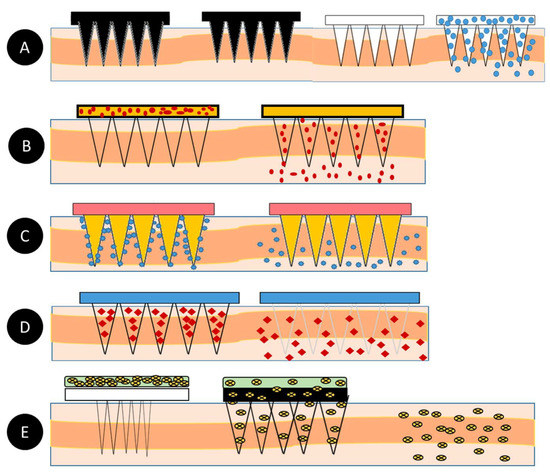 (A)—Solid microneedles; (B)—Hollow microneedles; (C)—Coated microneedles; (D)—Dissolving microneedles; (E)—Hydrogel-forming microneedles [40].