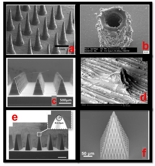 Scanning electron microscopy (SEM) images of microneedles (MNs): (a) Stereolithography (SLA) technique MNs [117], (b) Selective laser sintering (SLS) technique MNs [115], (c) Digital light processing (DLP) technique MNs [117], (d) Fused deposition modelling (FDM) technique MNs [118], (e) Continuous liquid interface production (CLIP) technique MNs [119], (f) Two-photon polymerization (2PP) technique MNs [117].