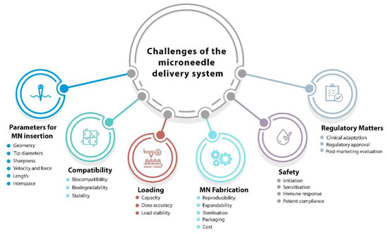 The biocompatibility of microneedles is essential when they are used in the delivery of drugs [166,167,168]. Biodegradable materials are usually desired because they degrade and can be safely removed from the skin. A critical assessment of the behavior of microneedles under different conditions (such as temperature and humidity) is required, as their stability could have an impact on the loaded therapeutics. Water can alter the mechanical properties of microneedles [169]. Therefore, in order to preserve and prolong their shelf-life (especially the dissolvable microneedles), they must be appropriately stored in a cool and dry place.