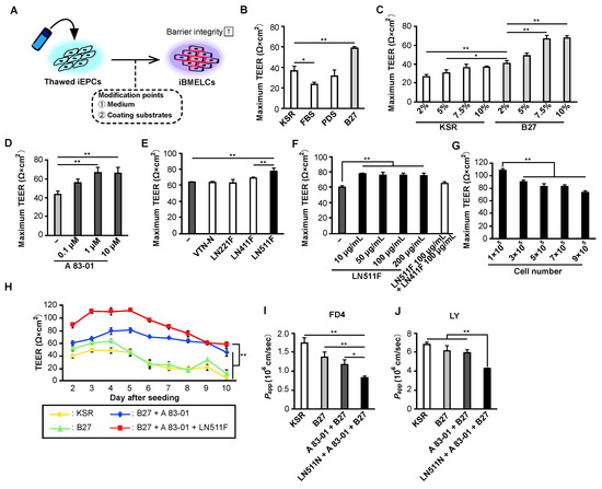 Evaluation of the physical barrier function of iEPCs under various conditions. (A) Strategy for the differentiation of E-iBMELCs. (B–F) Thawed iEPCs (7 × 105 cells/insert) were cultured under the indicated conditions. Measurement of TEER values from day 2 to 10 and the maximum value among them is shown. Data are presented as the mean ± SD (n = 3; * p < 0.05, ** p < 0.01). (B) Tukey’s HSD test; KSR group vs. others. (C) Tukey’s HSD test; 2% B-27 group vs. others. (D) Tukey’s HSD test; control vs. others. (E) Tukey’s HSD test; control vs. others, LN411F group vs. LN511F group. (F) Tukey’s HSD test; control vs. others. (G) Thawed iEPCs were seeded at the indicated number of cells and cultured under the indicated conditions. Measurement of TEER values of iEPCs from day 2 to 10 and the maximum value among them is shown. Data are presented as the mean ± SD (n = 3; ** p < 0.01; Tukey’s HSD test; 1 × 105 group vs. others). (H) Measurement of TEER values of iEPCs (1 × 105 cells/insert) cultured under the indicated conditions from day 2 to 10. Data are presented as the mean ± SD (n = 3; ** p < 0.01; two-way repeated measures analysis of variance; B-27, A-83-01, and LN511F group vs. others). (I,J) FD4 and LY permeability assay of iEPCs (1 × 105 cells/insert) cultured under the indicated conditions on day 4. Papp, apparent permeability coefficient. Data are presented as the mean ± SD (n = 3; * p < 0.05, ** p < 0.01; Tukey’s HSD test; B-27, A-83-01, and LN511F group vs. others).