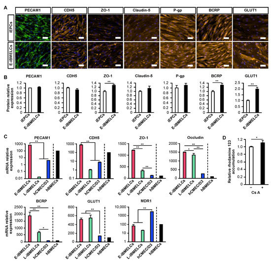 Characterization of E-iBMELCs. (A,B) Immunofluorescence analysis of PECAM1 (green), CDH5 (orange), ZO-1 (orange), claudin-5 (orange), P-gp (orange), BCRP (orange), and GLUT1 (orange) expression in iEPCs (cultured in HE-SFM supplemented with 20 ng/mL FGF2, penicillin-streptomycin solution, 7.5% KSR on a cell culture insert coated with a coating solution consisting of fibronectin and collagen type IV) and E-iBMELCs (cultured in HE-SFM supplemented with 20 ng/mL FGF2, penicillin-streptomycin solution, 7.5% B-27 supplement, and 1 μM A-83-01 on a cell culture insert coated with a coating solution consisting of fibronectin, collagen type IV and LN511F) on day 4. DAPI = blue. Scale bars = 50 μm. Relative protein expression levels were calculated based on fluorescence intensities. Data are presented as the mean ± SD (n = 3; ** p < 0.01; Student’s t-test). (C) Relative mRNA expression levels of PECAM1, CDH5, ZO-1, occludin, BCRP, GLUT1, and MDR1 in iBMELCs, L-iBMELCs, hCMEC/D3 cells, and hBMECs. The values are normalized to the expression of HPRT1. The relative mRNA expression levels of hBMECs were defined as 100. Data are presented as the mean ± SD (n = 3; * p < 0.05, ** p < 0.01; Tukey’s HSD test). hBMECs: n = 1. (D) Relative intracellular accumulation of rhodamine 123. The E-iBMELCs on day 4 were incubated with 10 μM rhodamine 123 in the absence or presence of 10 μM cyclosporin A (CsA) for 1 h at 37 °C. Relative fluorescence intensity values were normalized to a condition without CsA (set to 1). Data are presented as the mean ± SD (n = 3; * p < 0.05; Student’s t-test).