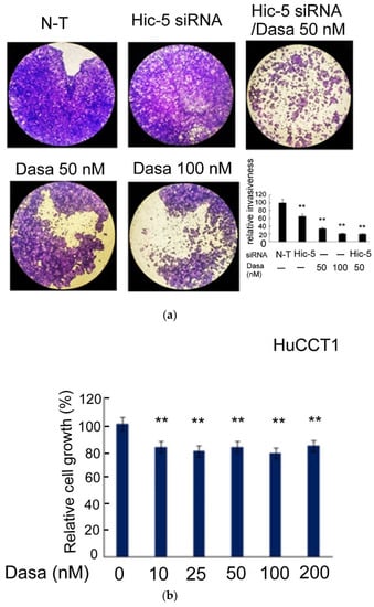 In a previous report, we demonstrated cotargeting Src and Hic-5 using the Src inhibitor dasatinib and Hic-5 siRNA, respectively, suppressed the cell migration of HuCCT1 in an additive manner [33]. We further investigated whether the same effect could be observed in HuCCT1 cell invasion. As shown in the transwell Matrigel invasion assay (Figure 1a), dasatinib (50–100 nM) suppressed HuCCT1 cell invasion by 67~80% dose-dependently. Moreover, the depletion of Hic-5 by 25 nM Hic-5siRNA suppressed HuCCT1 cell invasion by 37%. Remarkably, Hic-5 siRNA coupled with 50 nM dasatinib dramatically decreased HuCCT1 cell invasion by 82%, an effect higher than a single treatment of Hic-5 siRNA (by 35%) or 50 nM dasatinib (by 67%) and close to that of 100 nM dasatinib (by 80%) (Figure 1a). This demonstrated an enhanced effect of knocking down Hic-5 coupled with an inhibition of Src activity on suppressing HuCCT1 cell invasion. To evaluate the possibility that the decrease of cell invasion triggered by Src inhibitor and/or Hic-5 siRNA resulted from the decrease of cell proliferation, an MTT assay in HuCCT1 cells treated by dasatinib or transfected with Hic-5 siRNA was performed. As demonstrated in Figure 1b, HuCCT1 cell growth was slightly and constantly suppressed by dasatinib by 20% across the concentration range of 10~200 nM, whereas the depletion of Hic-5 did not affect HuCCT1 cell growth). Taken together, it can be estimated that 50–100 nM dasatinib inhibited cell invasion by 48~64%, after excluding the amount of decreased cell growth due to the dasatinib treatment.