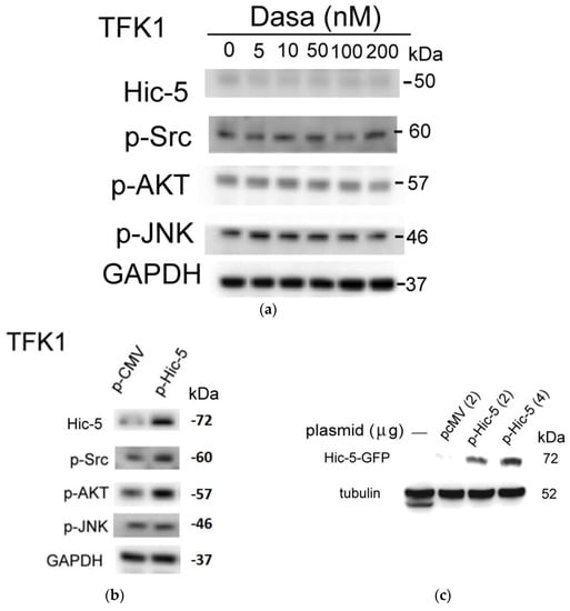To strengthen the notion that Src–Hic5 signaling is essential for the progression of CCA, another conventional CCA cell line, TFK1, was employed. TFK-1 was established from a surgical tumor of extrahepatic bile duct carcinomas, histologically diagnosed as partly papillary adenocarcinoma and partly differentiated tubular adenocarcinoma. However, Hic-5 mRNA and protein (Figure 2a) were very barely detected in TFK1, consistent with the very low motility of TFK1 cells observed in the transwell migration assay (Figure 2c, p-CMV group). These were in contrast with those observed in the high Hic-5 expressing HuCCT1 cells with high motility [33]. Moreover, dasatinib (5–200 nM) could not suppress the activation of Src, AKT and JNK in TFK1 cells (Figure 2a). Interestingly, the ectopic expression of Hic-5 (using Hic-5 expression plasmid driven by CMV promoter, p-Hic-5, 1.0 μg/mL) significantly activated Src and AKT (Figure 2b) compared with that of the p-CMV vector group. However, JNK was not activated by p-Hic-5. Notably, p-Hic-5 contains a GFP sequence added to the 3′ of the Hic-5 coding region as a tag for validating the ectopic expression of the Hic-5–GFP fusion protein (MW: 72 kDa) by the Western blot of GFP. As demonstrated in Figure 2c, whereas Hic-5–GFP could not be detected in the parental TFK1 cells (without plasmid transfection) and TFK1 cells transfected with the p-CMV vector, it was increased in TFK1 cells transfected with 2–4 μg/mL p-Hic-5, dose-dependently. Nonetheless, p-Hic-5 slightly increased the cell migration of TFK1 by 1.3–1.5-fold only (Figure 2d,e), suggesting that the increased Hic-5–GFP fusion protein expression per se was not enough to fully elevate TFK1 cell motility, probably due to the low efficiency of the Hic-5–GFP fusion protein in fully elevating the Src–AKT–JNK signaling. In addition, dasatinib did not decrease the cell growth of TFK1 cells using an MTT assay.