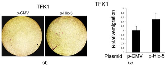 Ectopic expression of Hic-5 significantly enhanced the activation of Src, AKT and JNK for the cell migration of TFK1. TFK1 cells were treated with dasatinib (Dasa) at indicated concentrations (a) or transfected with Hic-5 expression plasmid (p-Hic-5) (b–d). Western blot of indicated molecules (a–c) and transwell migration assay of TFK1 (d) were performed. In (b,c), the Abs used for detecting p-Hic-5 encoded protein (Hic-5–GFP fusion protein) were Hic-5 and GFP, respectively, revealing the same molecular weight. In (d), the crystal-violet-stained, migrated cells were pictured under 40× magnification. (e) is the quantitative data of (d) using ImageJ software. Relative motility was calculated taking the data of the p-CMV vector as 1.0. The data shown are representative of two reproducible results.