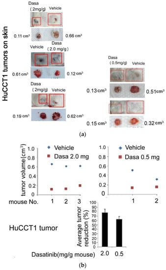 HuCCT1 cells (4 × 106) were subcutaneously inoculated on both left and right flanks of SCID mice for one week. Subsequently, indicated drugs were applied around cell inoculation site on one flank for the indicated times, whereas a vehicle (0.2% DMSO) was applied around that of the other flank in the same mouse serving as a control. After appropriate treatments, mice were sacrificed and the size of the HuCCT1 tumor volume was compared between the indicated groups and processed for the indicated experiments. The tumor volume (cm3) was measured as V = 1/2 × (l × w2), where V—volume, l—length, w—width, assuming an ellipsoid tumor with π = 3 according to the xenograft protocol described previously [40,41,42,43]. The advantage of this formula is based on the fact that width (w) and length (l) are the two diameters which can be measured accurately by a vernier caliper in vivo and there is no need to approximate the tumor height (which could result in an error). The therapeutic index (TI) of dasatinib was calculated as LD50/ED50, where LD50 is the lethal dose of dasatinib for 50% of the mice tested whereas ED50 is the minimum effective dose of dasatinib for 50% of the mice. For the TI calculation, we combined the data presented in the paper (dasatinib 0.5–2.0 mg/g mouse) and those obtained from higher doses of dasatinib (3.5–4.5 mg/g mouse), which revealed a substantial mortality rate, and that from lower doses of dasatinib (0.2–0.4 mg/g mouse), which displayed a lower effect of tumor suppression. After extrapolation of the dose-dependent curve fitting to the Hill equation, LD50 was estimated to be 2.8 mg/g mouse (n = 4), whereas ED50 was about 0.58 mg/g mouse (n = 6). Thus, the therapeutic index of dasatinib was estimated to be about 4.83 [LD50/ED50 = 2.8/0.58]. During animal experiments, which were approved by the Institutional Animal Care and Use Committee at Tzu Chi hospital, regulations relevant to the care and use of laboratory animals were followed.