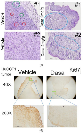 To validate whether Src–Hic-5 signaling is essential for HuCCT1 cell progression in vivo, we investigated the effect of dasatinib on preventing the development of an HuCCT1 tumor in SCID mice. HuCCT1 cells (4 × 106) were subcutaneously inoculated on both left and right flanks of SCID mice for 1 week. Subsequently, dasatinib (0.5 or 2 mg/g mouse) was applied around the cell inoculation site on one flank twice a week while a vehicle (0.2% DMSO) was applied on the other flank in the same mouse serving as a control. In the 2 mg/g mouse dasatinib group, the mice exhibited a prominent reduction of the HuCCT1 tumor, and three of them are demonstrated in Figure 3a (left panel). After dasatinib injection for 1.5 months, the volume of tumors developed on one flank of each of the mice treated with 2 mg/g dasatinib were about 0.11, 0.12 and 0.19 cm3, whereas those of the paired vehicle-treated group in the same mouse were about 0.66, 0.61 and 0.62 cm3, respectively. This revealed a reduction of about 83.4, 80.4 and 70%, respectively, (average 78%) of the HuCCT1 tumor development on mice skins treated with 2 mg/g dasatinib compared with each of the vehicle-treated groups (Figure 3b, upper left and lower panel). In the 0.5 mg/g mouse group, the reduction of tumor volume was less evident, and two of them are demonstrated in Figure 3b (right panel). After dasatinib injection for 1.0 month, the tumor developed on skins of the mice treated with 0.5 mg/g dasatinib were 0.13 and 0.15 cm3, whereas those of the paired vehicle-treated group in the same mouse were 0.51 and 0.32 cm3, respectively. This revealed a reduction of about 74 and 51%, respectively, (average 62.5%) of the HuCCT1 tumor development on mice skins treated with 0.5 mg/g dasatinib, compared with each of the vehicle-treated groups (Figure 3b, upper right and lower panel). The therapeutic index of dasatinib, calculated by (LD50/ED50), was estimated to be about 4.83, where LD50 (the lethal dose of dasatinib for 50% of the mice tested) was 2.8 mg/g mouse and ED50 (the minimum effective dose of dasatinib for 50% of the mice) was 0.58 mg/g mouse (please see detailed calculation process in Section 2.7). Collectively, dasatinib dose-dependently suppressed the progression of the HuCCT1 tumor. To examine the patho-physiological changes associated with the suppression of the HuCCT1 tumor development triggered by dasatinib, a hematoxylin–eosin (H.E.) stain of the tissue sections was performed to observe the status of the tumor progression, whereas the immunohistochemistry (IHC) of Ki 67 was used for assaying the proliferative activities of the tumors. As shown on two different spots in the vehicle-treated tumor sections (Figure 3c, left panel), polymorphic, crowd and poorly differentiated HuCCT1 tumor cells with a high nucleus-to-cytoplasm ratio were observed. Moreover, the tissues exhibited scant ducts formation (red circles) and small blood vessels (green circles) with some invasive tumor cells inside. In contrast, on two different spots in the tissue sections from dasatinib-treated mice (2 mg/g mouse), no residual tumor cell was observed. Instead, it presented as granulation and fibrotic tissue with chronic inflammation across the sections (blue circles). On the other hand, the immunostaining of Ki67 demonstrated the expression of Ki-67 was reduced in two of the 2.0 mg/g dasatinib-treated tissue sections by about 20–30% compared with that in the other two vehicle-treated group (Figure 3d), indicating the proliferative activities of HuCCT1 tumors were significantly suppressed by dasatinib. This is consistent with the slightly decreased cell growth (by 20%) of cultured HuCCT1 cells induced by dasatinib for 48 h using the MTT assay (Figure 1b). Taken together, the inhibition of Src activity could suppress the development of HuCCT1 tumors on SCID mice skin.