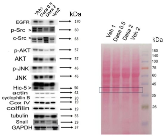 Signal molecules suppressed in HuCCT1 tumors treated with dasatinib. The tissue lysates of HuCCT1 tumors harvested from SCID mice skins treated with vehicles (Veh1 and Veh2) and dasatinib at indicated concentration (Dasa 0.5 and Dasa 2 mg/g mouse, paired with Veh1 and Veh2, respectively) were extracted for a Western blot of the indicated molecules (left panel). Ponceau S staining of the blot (right panel) was demonstrated as a loading control. In the right panel, blue rectangles enclose the band close to 37 kDa, suspected of GAPDH, which was shown to be decreased in dasatinib (2.0 mg/g)-treated samples in a Western blot. The data shown are representatives of two reproducible results.