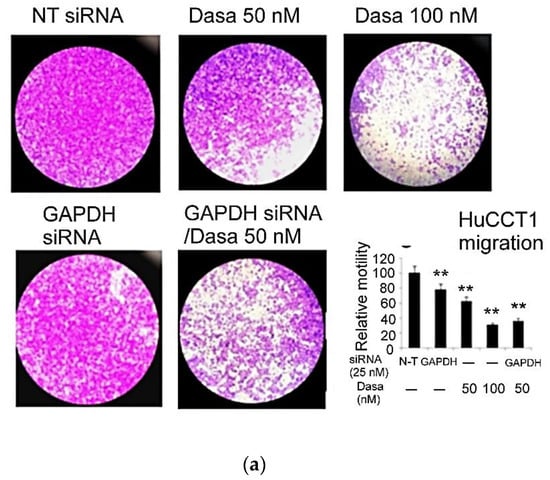 GAPDH mRNA and protein are downregulated by dasatinib and required for HuCCT1 migration. HuCCT1 cells were transfected with GAPDH siRNA and/or treated with the Src inhibitor dasatinib (Dasa) at indicated concentrations (a,b) or treated with dasatinib at indicated concentrations (c) for 48 h. Transwell migration assay (a), Western blot (b) and RT-PCR (c) were performed using β actin (b) and ERK (c) as internal controls. In (a), the images are the crystal-violet-stained, migrated cells pictured under a 40× magnification. The resultant quantitative data obtained using ImageJ software are shown in lower right panel. Relative motility was calculated taking the data of the nontargeting (N-T) group as 100%. (**) represents the statistical significance (p < 0.05, N = 3) of the difference between the indicated samples and the nontargeting (N-T) group. In (b,c), the numbers below each of the bands indicate the relative band intensities, taking the data of β actin (b) and ERK (c) as 1.0. The data shown are the average of two reproducible results, with a coefficient of variation (C.V.) of 9%.