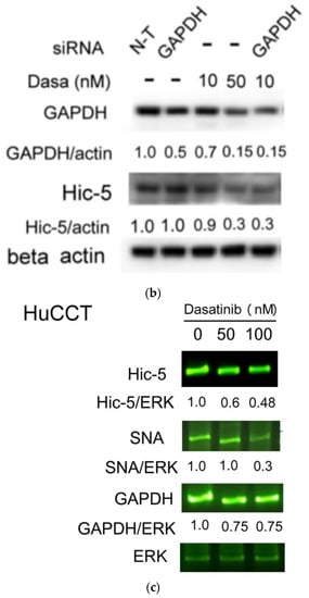Classically, GAPDH is an essential enzyme catalyzing the redox reaction in the glycolytic pathway by converting glyceraldehyde-3-phosphate to 1,3-bisphosphoglycerate with a reduction of NAD+ to NADH. Recently, it was found to play an important role in tumorigenesis associated with enhanced glycolysis and energy production required for cancer progression, i.e., the Warburg effect [46]. Moreover, GAPDH expression was elevated in colon cancer and metastatic liver tissues [46], which suggested that an increased GAPDH contributed to colon cancer metastasis by providing more energy required for tumor progression. Remarkably, the depletion of the metastatic scaffolding protein NEDD9, which reduced Src activity could lead to the reduction of glycolytic enzymes including GAPDH [47]. Moreover, decreasing GAPDH caused a downregulation of the gene expression of Snail (SNA), one of the well-known EMT transcription factors involved in tumor progression [45]. Interestingly, SNA was also suppressed in the high-dose (2.0 mg/g mouse) dasatinib-treated HuCCT1 tumor (Figure 4). Accordingly, we sought to investigate whether GAPDH was involved in cell migration mediated by Hic-5–Src signaling in cultured HuCCT1 cells. As demonstrated in Figure 5a, the depletion of GAPDH (by GAPDH siRNA) for 48 h suppressed HuCCT1 cell migration by 23%, compared with the nontargeting (N-T) group, whereas 50 and 100 nM dasatinib suppressed HuCCT1 cell migration by 40 and 68%, respectively. Moreover, the combined inhibition of Src (using Dasa at 50 nM) coupled with the depletion of GAPDH decreased HuCCT1 cell migration by 75%, an extent significantly higher than that observed in either the depletion of GAPDH (by 23%) or the 50 nM Dasa-treated group alone (by 38%) (Figure 5a). The efficiency of GAPDH siRNA was verified in Figure 5b, showing a decrease of GAPDH protein by 50% in cells transfected with 25 nM GAPDH siRNA for 48 h compared with that of the nontargeting (N-T) group. Interestingly, the expression of GAPDH protein was decreased by dasatinib at 10 and 50 nM for 48 h by 30 and 85%, respectively, using β-actin as the loading control (Figure 5b). Such an inhibitory effect was not observed in HuCCT1 cells treated with dasatinib for 24 h in our previous study [33]. Moreover, 10 nM dasatinib coupled with GAPDH siRNA decreased the expression of GAPDH by 85%, an extent significantly higher than either GAPDH siRNA (by 50%) or 10 nM dasatinib alone (by 30%) (Figure 5b). Moreover, consistent with the data demonstrated in our previous report [33], 10 and 50 nM dasatinib inhibited the expression of Hic-5 by 10 and 70%, respectively, (Figure 5b). Surprisingly, 10 nM dasatinib combined with GAPDH siRNA decreased the expression of Hic-5 by 70%, much higher than 10 nM dasatinib alone (10%), implicating GAPDH coupled with Src can also be upstream of Hic-5. On the other hand, the RT-PCR analysis demonstrated dasatinib significantly suppressed the mRNA of GAPDH and Hic-5 by 25–40% at 50 and 100 nM concentration in a dose-dependent manner, whereas it suppressed SNA mRNA at 100 nM by 70% for 48 h (Figure 5c). In contrast, dasatinib did not decrease the mRNA of ERK, one of the MAPK, which may serve as an internal control (Figure 5c). Taken together, GAPDH played as a downstream effector in Src–Hic-5 signaling cascade for HuCCT1 cell migration.