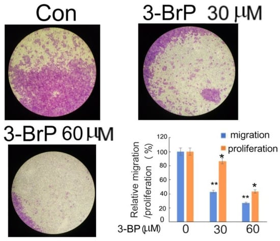 Since GAPDH is required for one of the key steps in the glycolysis pathway, we further investigated whether glycolysis was required for HuCCT1 cell progression. To this end, 3-Bromopyruvated (3-BrP), one of the anticancer agents capable of targeting the glycolytic enzymes, including GAPDH [46,54], was employed. As demonstrated in Figure 6, 30 and 60 μM 3-BrP effectively suppressed HuCCT1 cell migration by 62 and 75% in a dose-dependent manner, whereas the MTT assay demonstrated the inhibition of HuCCT1 cell growth, by 12 and 65%, respectively. Remarkably, while 30 μM 3-BrP slightly reduced HuCCT1cell growth (by 12%), it induced a much higher inhibitory effect on HuCCT1 cell migration (by 62%). However, 60 μM 3-BrP exerted dramatic suppressive effects on both the proliferation and migration (65 and 75%, respectively) of HuCCT1 cells, revealing a prominent toxic response of HuCCT1 cells at this concentration. In addition, 15 μM 3-BrP did not exhibit a suppressive effect on both the migration and proliferation of HuCCT1 cells. In summary, 30 μM was the most optimal concentration for 3-BrP to trigger a substantially suppressive effect on HuCCT1 cell migration by about 50%, after excluding the slightly inhibitory effect on cell growth.