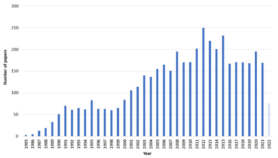 All papers were evaluated based on the defined selection criteria, and the risk of bias assessment was performed for appropriate studies. Identifying the year 1982 as the year that this field emerged, we found a remarkable increase in publications concerned with GET up to 2022 (Figure 1).