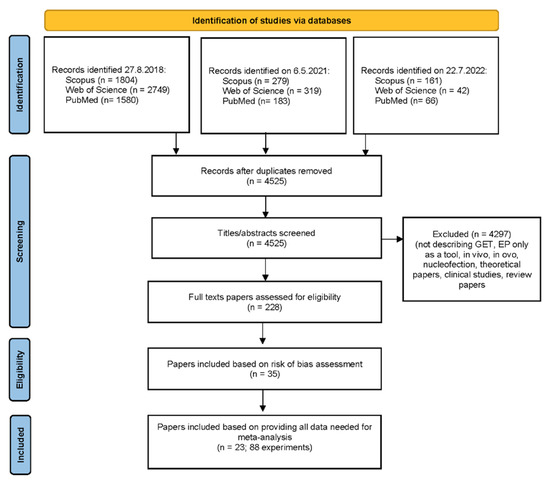 The first screening of potentially relevant papers was performed based on the title and abstract. At this stage, papers that did not report GET or reported GET on prokaryotes, in vivo, in ovo, clinical, and theoretical papers were excluded. We also excluded papers in which GET was used only as a tool and thus did not test multiple electroporation parameters, and papers in which only “nucleofection” was used. After initial screening, full-text versions from the papers that compared GET efficiency depending on varying at least one electrical or biological parameter were obtained if possible.