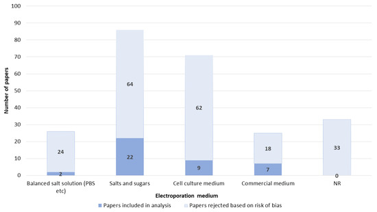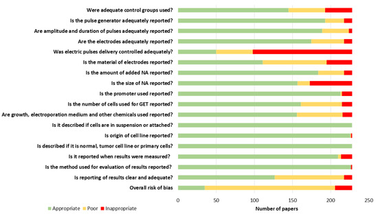 Because of the poor or inappropriate reporting of at least some parameters in most papers for the overall paper risk of bias assessment, only 10 parameters were chosen (bolded in Table 2) for the further evaluation of papers. The parameters were the controls used, description of electrodes, pulses, pulse generators, concentration, size and promoter of NA, number of cells, electroporation medium, and reporting of the results. Papers were noted as appropriate only if all 10 parameters were appropriately described. If between 5 and 9 of the chosen parameters were described appropriately, then the overall paper risk of bias was poor. If four or fewer of the parameters were described appropriately, then the paper was noted as inappropriate.