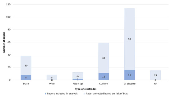 The types of electrodes were further divided into six groups: plate, wire, neon tip, electroporation cuvette, custom-made electrodes, and not reported. All types of electrodes that did not match the first four groups were classified into a custom-made electrodes group. If the study reported that electroporation cuvettes were used and the material of the electrodes was not reported, then we determined the material of the electrodes based on the manufacturer of the electrodes.