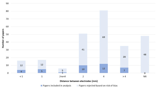 Distance between the electrodes. NR—not reported.