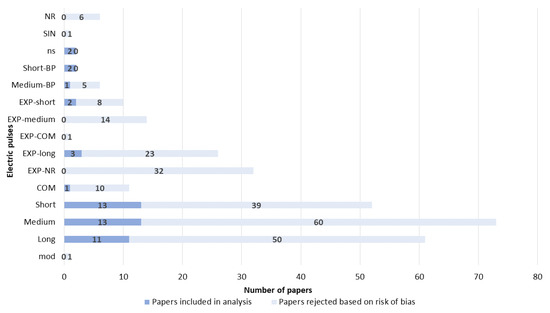 Pulses were first divided in five groups based on pulse duration: short (1–499 µs), medium (500 µs–9.9 ms), long (10 ms or longer), nanosecond pulses (ns) (less than 999 ns), or combinations of pulses (COM). During the review, the need arose, and additional groups were added: exponential pulse (EXP-long, EXP-medium, EXP-short, and EXP-COM), RF-modulated square wave pulse (mod), sinusoidal (SIN), and bipolar square wave pulse (short-BP and medium-BP).
