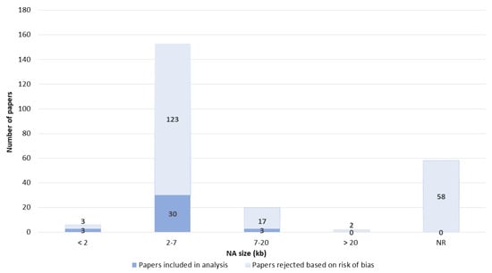 The sizes of the NA transfected ranged from 23 bp to 48 kb. Overall, 2–7 kb was the most used size. The size of the NA was one of the categories that was often not reported. Around 25% of papers did not report the NA size (Figure 8).