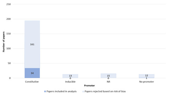 The promoters were divided into constitutive and inducible promoters. The majority of papers reported the use of constitutive promoters (Figure 9). Among constitutive promoters, CMV and SV40 were used most often.