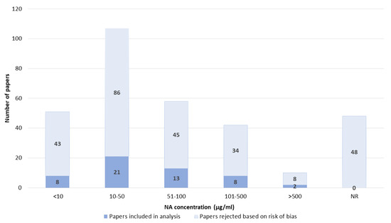 The NA concentration was also often not reported. Most papers reported concentrations between 10 and 50 µg/mL. Concentrations lower than 10 µg/mL and higher concentrations of NA were also reported; in particular, 51–100 µg/mL and 101–500 µg/mL were also commonly used. Concentrations higher than 500 µg/mL were rarely reported (Figure 10).