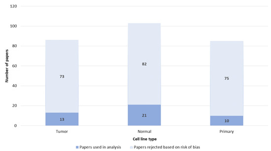 Cell lines were divided into three groups, namely tumor, normal or primary cells. All three groups of cells were used in a similar number of papers (Figure 11).