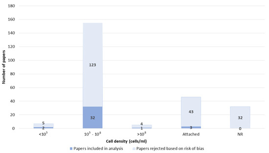 The density of cells electroporated in the suspension was divided into three groups: up to 105, 105–108, and higher than 108 cells per milliliter. Most papers reported GET with a cell density between 105 and 108 (Figure 12).