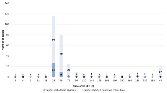For statistical analysis, the standard deviation or error of the results and the sample size were collected where possible. If it was not clear whether the paper reported the standard deviation or standard error of the mean, then it was assumed to be a standard error. If a range of sample sizes was given, the lowest value was extracted. The online program GraphReader.com (Accessed on 2 May 2022, http://www.graphreader.com/) was used to extract results presented in graphical form if not given in tables or text.