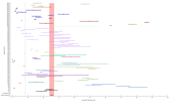 The meta-analysis was performed using MetaLab (available at https://github.com/NMikolajewicz/MetaLab, accessed on 1 October 2020), with a free toolbox for meta-analysis developed in MATLAB R2016b [40]. The main outcome selected from the papers was the overall GET efficiency, which represents the percentage of transfected cells based on the number of cells exposed to the electric pulses. If the overall GET efficiency was not reported, it was calculated as the percentage of transfected cells multiplied by the percentage of viable cells divided by 100. The standard deviation and standard error of the overall GET were calculated from the standard deviations of transfected and viable cells and the sample size according to the error propagation rule.