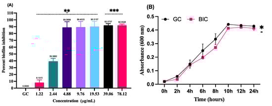 (A) Percent biofilm inhibition in S. pyogenes. The inhibition of biofilm formed by S. pyogenes in presence of LME at various concentrations. GC, growth control. *** p value = 0.0002, ** p value = 0.0042. (B) Growth curve dynamics. Figure represents the effect of LME (at BIC value) on the growth curve of S. pyogenes. * p value = 0.014.