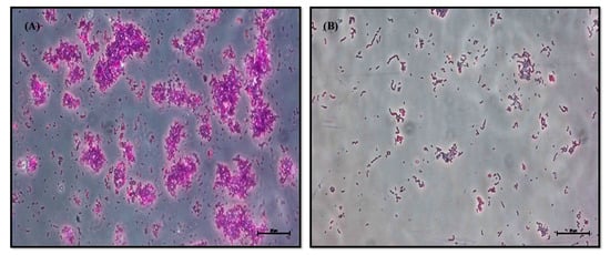 Light micrograph of biofilm formed by S. pyogenes. The figure displays, (A) the control S. pyogenes forming a well—structured biofilm stained with crystal violet. (B) LME (4.88 μg/mL) impedes microcolony and biofilm formation in S. pyogenes.