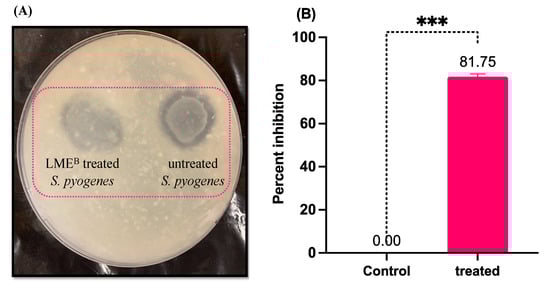 Effect of LME on extracellular protease production in S. pyogenes. (A) The picture shows the diminished zone of proteolysis around S. pyogenes growth in tryptose agar medium (1% skim milk) when treated with LME. (B) The percent inhibition of extracellular protease production in treated and untreated S. pyogenes. *** p value = 0.0001.