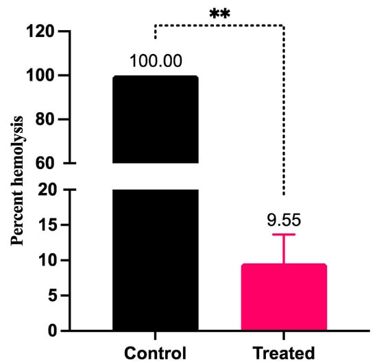 Effect of KAU007 on hemolytic property of S. pyogenes. The figure represents the impact of LME on percent streptococcal hemolysis ** p value = 0.001.