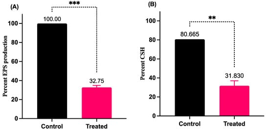 Effect of LME on EPS production and cell surface hydrophobicity (CSH). The figure demonstrates the modulation of EPS production (*** p value = 0.0005) and CSH (** p value = 0.0056) in the presence (treated) and absence (control) of LME.