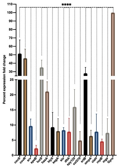 Percent expression fold change in biofilm and virulence-associated genes of S. pyogenes. The qPCR analysis demonstrated the modulatory effect of LME on the expression profile of target genes associated with biofilm and virulence in S. pyogenes. **** p value < 0.0001.