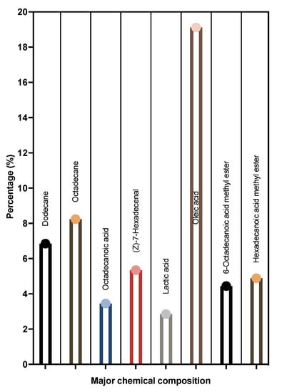 The GC-MS analysis of LME results in the identification of various compounds. The major composition of LME is shown in Figure 7. The metabolic profile obtained from the typical GC-MS total ion chromatogram (TIC) is illustrated in Figure S1. From the TIC, 32 endogenous metabolites were identified, with major components being long-chain saturated fatty acids, hydroxy acids, long-chain carboxylic acid derivatives, aliphatic hydrocarbons, and some miscellaneous compounds in small proportions, as shown in Table S1.