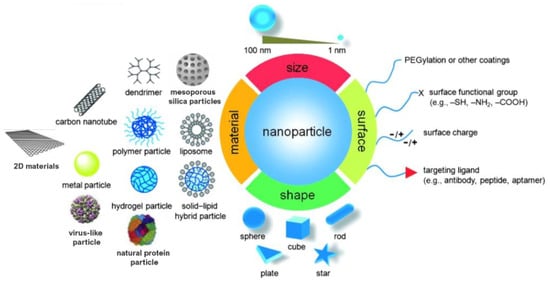 Monitoring the size and shape of nanoparticles can help to improve their performance in specific applications (Figure 1). Similarly, characteristics such as chemical composition, charge and the surface can be altered to suit specific purposes. Additionally, functional groups, hydrophilicity, attachment and conjugation with targeting ligands also comprise the essential parameters that need to be considered [9,10].